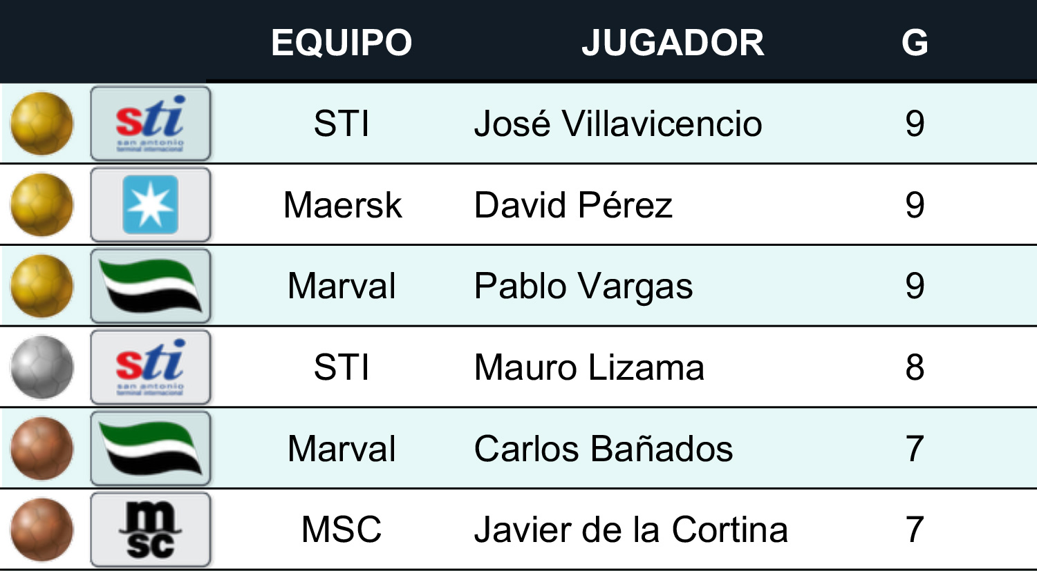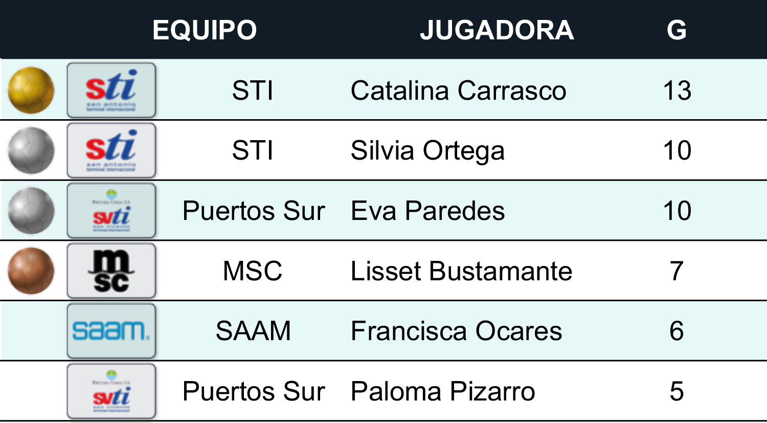 16a. versión Campeonato Hanseatic Global Terminals INICIOFIXTURE LIGA FEMENINA Equipos Resultados Goleadoras LIGA MASCULINA Equipos Resultados Goleadores PALMARÉS NOTICIAS RECIENTES El Campeonato Hanseatic Global Terminals tuvo cuatro goleadoresMás de 340 goles se marcaron en la temporada 2025 del Campeonato Hanseatic Global TerminalsGalería: Revive la Semifinal del Campeonato Hanseatic Global Terminals 2025STI y MSC disputarán la final femenina del Campeonato Hanseatic Global TerminalsMaersk se verá las caras ante STI en la final del Campeonato Hanseatic Global Terminals78 goles se convirtieron en la tercera jornada del Campeonato Hanseatic Global TerminalsDel Mundial sub 20 al Campeonato Hanseatic Global TerminalsRegistro de goles en la segunda fecha del Campeonato Hanseatic Global Terminals superó con creces a la primera jornada Ver más noticias 348Goles realizados 52Partidos disputados 10Equipos femeninos 16Equipos masculinosCONOCE A LOS EQUIPOS Liga FemeninaLiga MasculinaLiga Femenina CMA CGM Hapag-Lloyd Maersk MSC ONE Puertos Norte SAAM STI Puertos Sur Hanseatic Global TerminalsLiga Masculina Evergreen Hapag-Lloyd Maersk MSC Puertos Norte SAAM STI SVTI Hanseatic Global Terminals Portuaria Corral CMA CGM Cosco Shipping ONE Marval PIL UMARRESULTADOS GOLEADORES Ver todos Ver todos