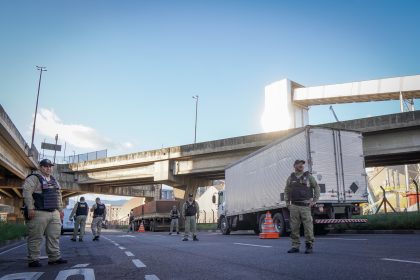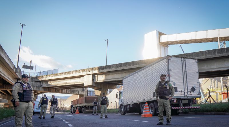 A Guarda Portuária e a Superintendência de Meio Ambiente da APS realizaram uma blitz na via perimetral da margem direita do Porto de Santos, perto do Viaduto Paquetá, para fiscalizar irregularidades e dialogar com motoristas sobre a importância da direção consciente.