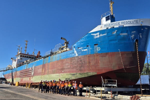 La tripulación del buque Riverside Resolute, una draga de succión con tolva de brazo de arrastre (THSD) operada por Riverside Industrial Sands se unió al equipo de Austal para celebrar la ocasión con una fotografía grupal junto a la grada completamente renovada.