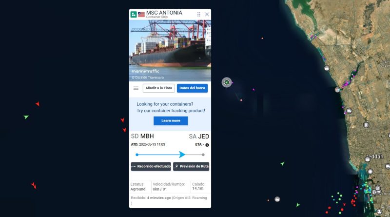 El MSC Antonia es un buque de 7 mil TEU de capacidad que, de acuerdo a un análisis de la consultora Windward, habría sido llevado de forma errónea a los bajíos de Eliza al oeste del Puerto de Jeddah.
