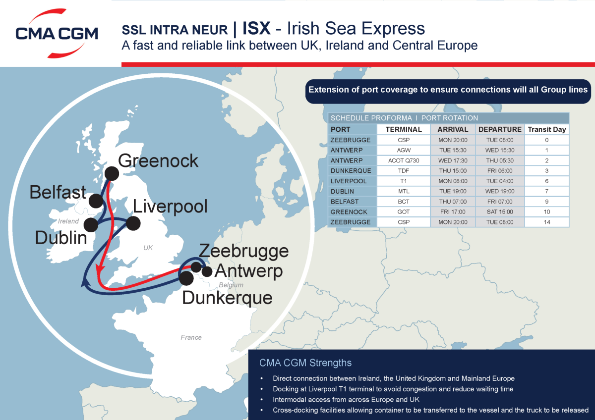 Actualización del servicio Irish Sea Express ISX de CMA CGM con la introducción de una escala en Zeebrugge, Bélgica