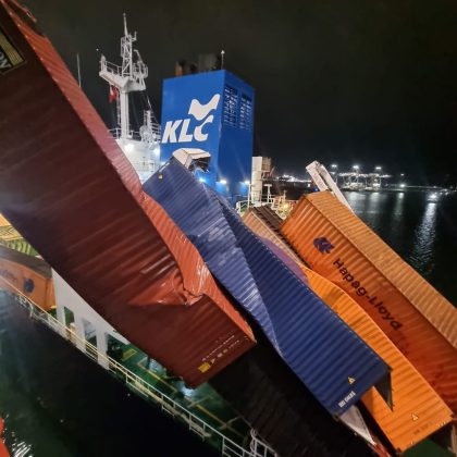 El hecho ocurrió cuando se trabajaba en la descarga del portacontenedores en APM Terminals Maasvlakte II, momento en el que algunas de las piezas contenerizadas acabaron en el agua y otras sobre la cubierta del barco que abastecía GNL, consignó el medio Schuttevaer.