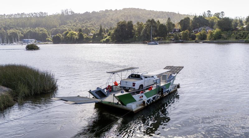 Ingenieros de la Universidad Austral de Chile y la empresa Navtec diseñaron y construyeron la primera barcaza autónoma y eléctrica del país, la que conecta Isla San Francisco con la ribera en solo cuatro minutos gracias a energía solar y sensores de última generación.