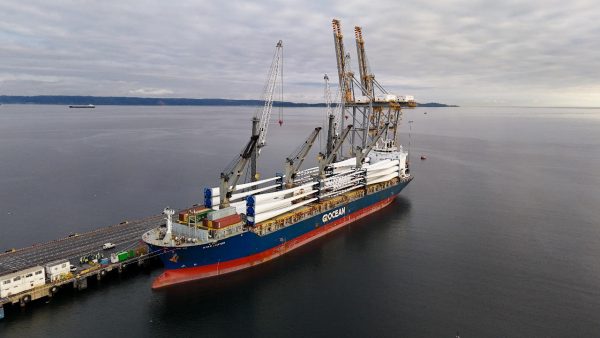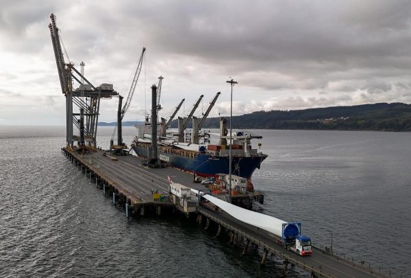 DP World, terminal de Lirquén, inició la descarga de los aerogeneradores más grandes que han llegado a Chile. Cada uno de ellos cuenta con aspas de 90 metros de largo y secciones que superan las 130 toneladas.