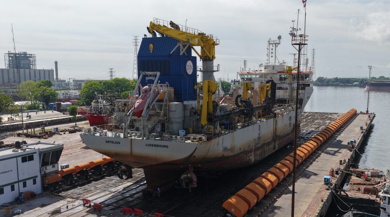 La draga de Jan De Nul, Ortelius, se encuentra actualmente en la grada N° II de Tandanor, donde se desarrollan tareas integrales de reparación y mantenimiento. La embarcación especializada tiene 111,7 metros de eslora y 24,6 metros de manga.