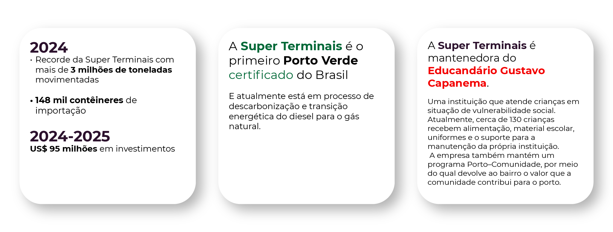 “Embora a Super Terminais tenha apenas 30 anos, o grupo completará 50 anos em 2027. Esse é o segredo: somos uma empresa transparente, séria, com propósito, com processos bem definidos, que valoriza seus colaboradores, sua localização e o meio ambiente.”