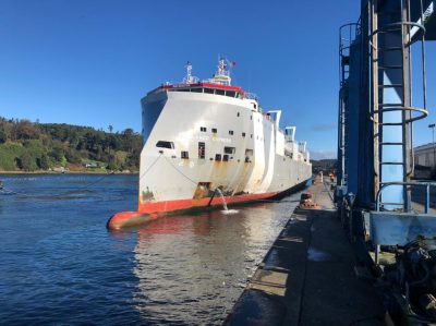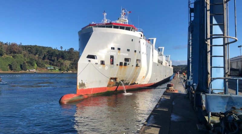 “A pesar de los fuertes vientos en nuestra ciudad de #PuertoMontt, pero en un tremendo día muy despejado, hoy recaló el carguero #GirolandoExpress, el cual embarcará cerca de 3.955 cabezas de ganado, a través de la empresa United Chile, para hacer exportados a China”, posteó la Empresa Portuaria Puerto Montt en su cuenta de twitter.