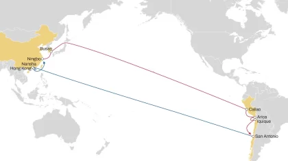 La ruta conecta en 23 días Asia con Callao, compitiendo con la oferta de Chancay, pero también considera escalas directas en los puertos chilenos de Arica e Iquique y en el terminal de San Antonio, desde donde los buques del Alpaca zarparán directo a China para recalar a Nansha, Hong Kong y Ningbo, que también son puerta de entrada para las cerezas.