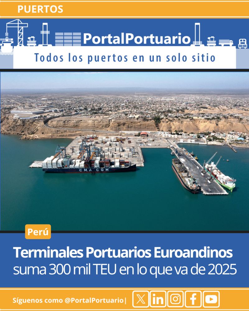 Si bien, como se indicó en la edición anterior del Radar de PortalPortuario, Chancay desplazó al cuarto lugar en manejo de contenedores a Terminales Portuarios Euroandinos, no es menor indicar que ese recinto portuario completó una transferencia de 300 mil TEU en lo que va del año, siendo este resultado un 51% más alto que en 2024 a igual fecha.