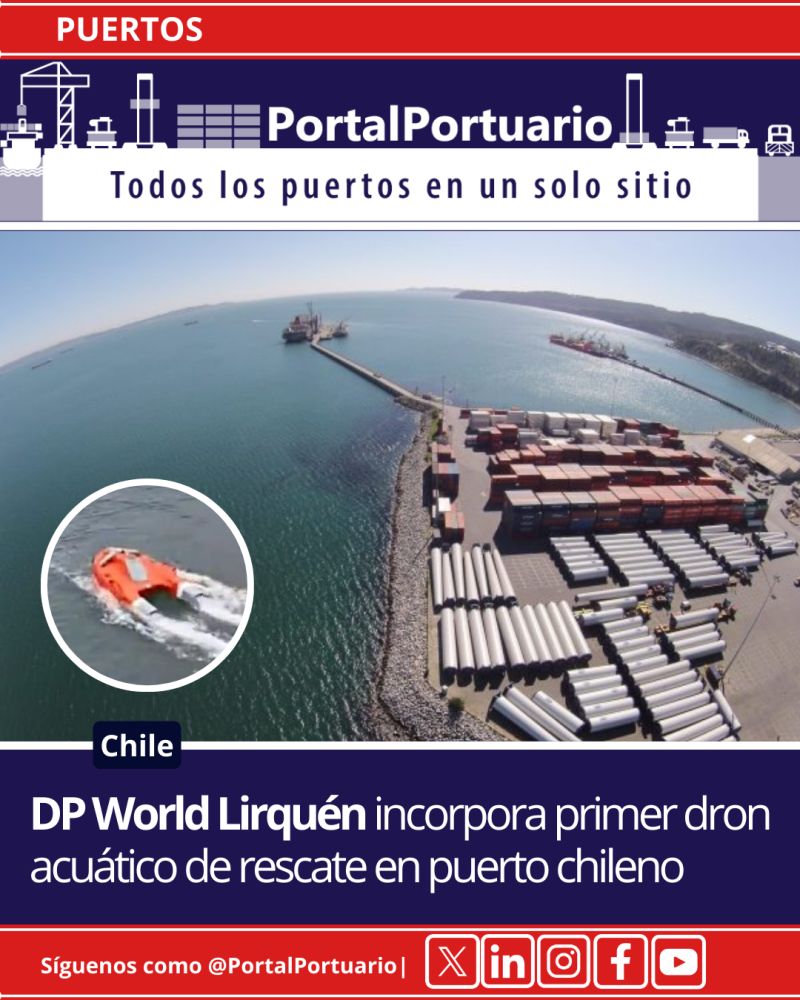 DP World Lirquen, en la Región del Bio Bio, sur de Chile, implementó un llamativo dron salvavidas que, operado de manera remota, apunta a dar una rápida respuesta a incidentes relacionados a personas caídas al mar.