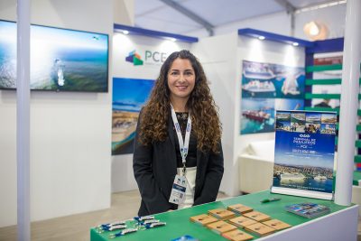 Constanza Ramírez en el stand de Puertos y Logística (PULOGSA)