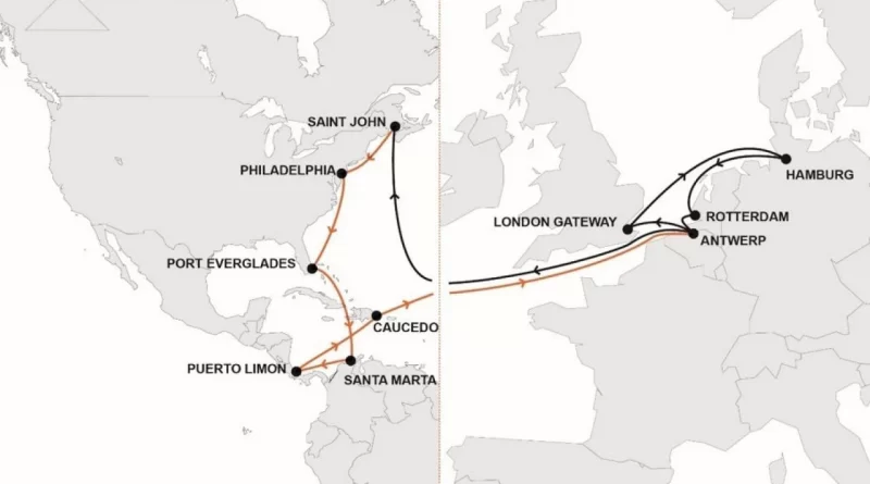 La nueva rotación comienza en Amberes; Bélgica, y sigue a través de London Gateway, Reino Unido,, Hamburgo; en Alemania, y Rotterdam, Países Bajos, para hacer nuevamente una escala en Amberes antes de partir a Saint John, en Canadá, bajar a Philadelphia y Port Everglades; en Estados Unidos, y, desde allí, conectar con los puertos de Santa Marta; en Colombia, Limón, en Costa Rica, Caucedo; en República Dominicana, y -finalmente- volver a su punto de partida en el puerto belga.
