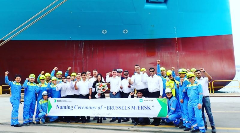 HD Hyundai Heavy Industries (HHI), con sede en Ulsan, Corea del Sur, entregó recientemente un nuevo portacontenedores de 17.480 TEU a la naviera danesa Maersk. Se trata del navío Brussels Maersk, la cuarta unidad de una serie de seis buques idénticos encargados a finales de 2022, los que están habilitados para operar con metanol.