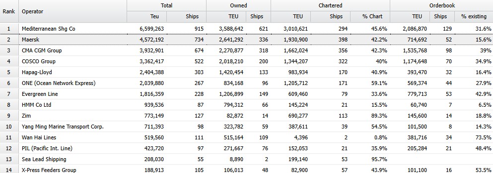 El ranking que muestra la capacidad de las 100 principales navieras del orbe sigue con Maersk que opera 734 naves con una capacidad de movilización de 4.572.192 TEU.