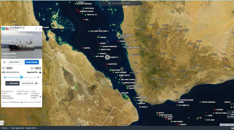 Otro granelero con bandera de Liberia y operado por Grecia, el Eternity C, fue atacado con drones marítimos y esquifes frente al Puerto de Al Hudayda, según dio cuenta a Reuters su operador, la empresa Cosmoship Management.