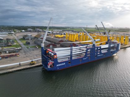 El buque de suministro del proyecto, diseñado específicamente para manipular componentes de turbinas eólicas marinas más grandes y pesadas, recogió las palas de 108 metros de largo en el Puerto de Aalborg, Dinamarca.