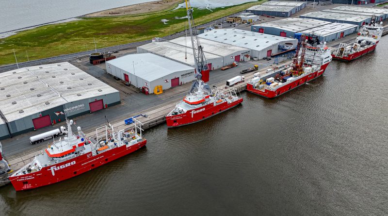 Wagenborg recibió recientemente cuatro buques Fugro en la Handelskade de Delfzijl, en Países Bajos, demostrando su papel estratégico para proyectos marítimos.