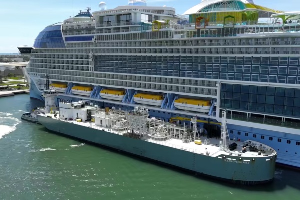 El barco con puerto base más nuevo de Port Canaveral, el Star of the Seas, de Royal Caribbean International, el crucero más grande del mundo, repostó GNL por primera vez en la terminal en Florida, en preparación para su viaje inaugural el 16 de agosto.