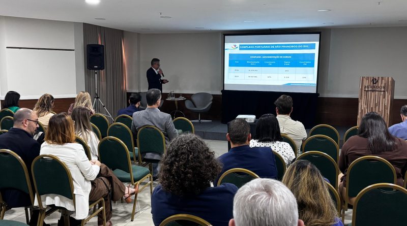 O gerente de Meio Ambiente do Porto de São Francisco, Oscar Schmidt, apresentou à plateia os principais aspectos da obra que aproveitará parte dos sedimentos da dragagem para a ampliação de sete quilômetros da Praia de Itapoá, que nos últimos anos tem sofrido com erosão marítima.