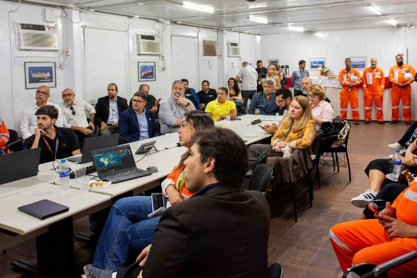 Em seguida, o grupo realizou um tour pelas instalações do porto, com parada para coffee break e apresentações técnicas da Petrobras e da Triunfo Logística, que destacaram suas operações e iniciativas de inovação tecnológica e sustentável.