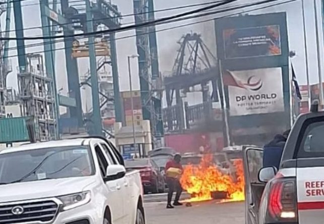 Un grupo de portuarios colocó barricadas incendiarias en la calle de acceso a DP World San Antonio y zonas aledañas. La razón y fin del acto no se encuentra del todo claro.