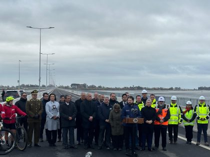En el marco de la ceremonia, el mandatario comentó que “este puente beneficia a todo el país, porque permite conectar sectores productivos, fortalecer el transporte de carga y potenciar la logística vial con los puertos de Lirquén, Talcahuano, San Vicente y Coronel“.