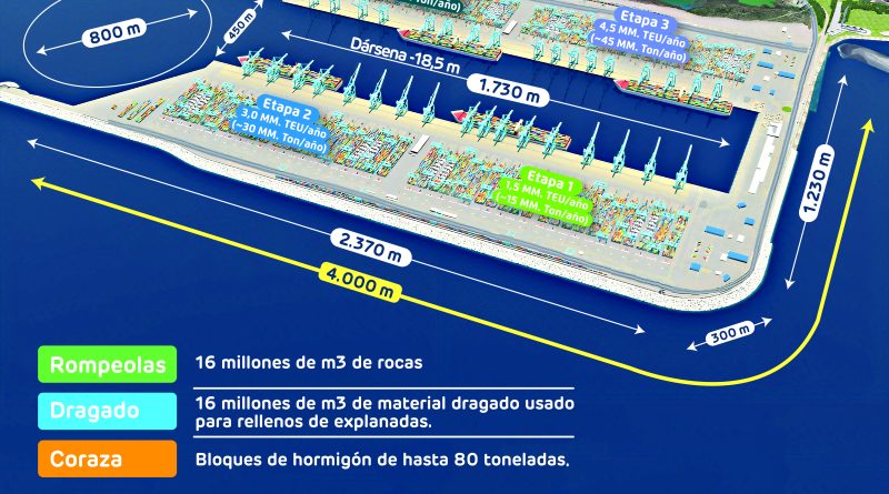 El directivo agregó que “Puerto Exterior, que consolidará la actual posición de San Antonio como uno de los principales puertos de América Latina y el Caribe, considera la construcción de dos terminales de una longitud de 1.730 metros cada uno. En plena operación, tendrá la capacidad de transferir hasta 6 millones de TEU anuales (aproximadamente 60 millones de toneladas de carga al año), lo cual se logrará de forma progresiva según las proyecciones de demanda. La nueva infraestructura, que debería estar operativa a partir de 2036, permitirá recibir y operar en óptimas condiciones naves portacontenedores de última generación, cuyas longitudes alcanzan los 400 metros”.