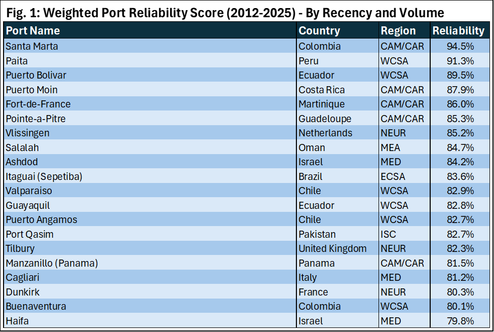 El que encabeza la lista es el Puerto de Santa Marta, Colombia, seguido de Paita, Perú, y Bolívar, Ecuador. La lista también incluye a Moín; Costa Rica, Itaguaí; Brasil, Valparaíso; Chile, y Guayaquil, Ecuador, como los complejos portuarios más fiables en cuanto al respeto de sus ventanas de atraque.