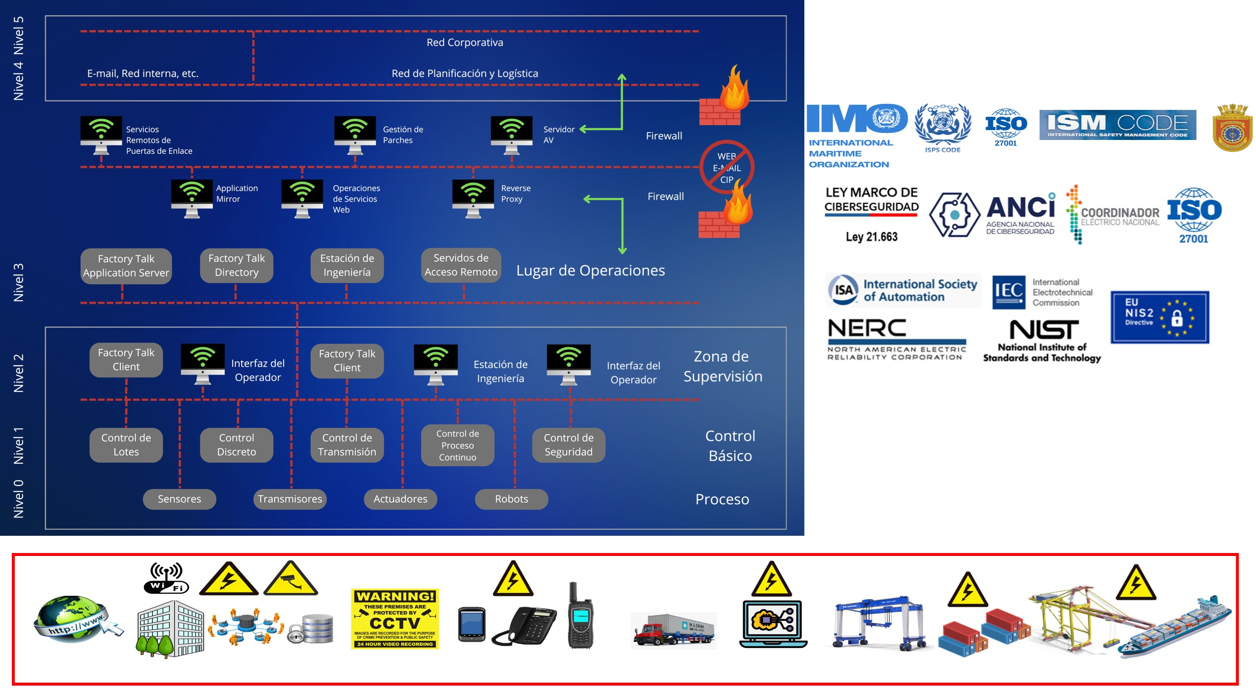 Este desafío, una creciente necesidad para trascender de la infraestructura móvil de apoyo a la operación, sino que se sume a la infraestructura fija y alimente a las demás, se suma a la nueva institucionalidad que este año comenzó a dejarse sentir en la industria con la Agencia Nacional de Ciberseguridad y, la carga regulatoria de la Ley 21.663, junto con, la cuenta regresiva definida para el 16 de junio, para el cumplimiento de requisitos de ciberseguridad marítima, contenidos en la Circular Marítima Directemar O-75/006, más todas aquellas que ya son tendencia a nivel global, como los frameworks industriales, NERC-CIP (North American Reliability Corporation – Critical Infrastructure Protection), ISA/IEC 62443 (International Society of Automation y la International Electrotechnical Commission), la Directiva NIS2 y otras más, que conforman el alcance regulatorio que Chile ya tiene observado para el cumplimiento de la industria, de norte a sur, de cordillera a mar.