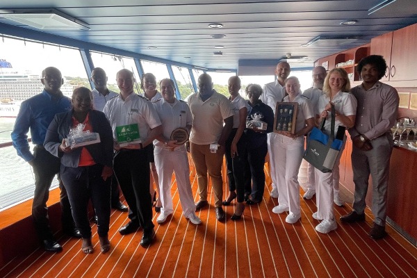 Representantes del Ministerio de Turismo, la Autoridad de Turismo, Invest Saint Lucia, la Autoridad de Puertos Aéreos y Marítimos, los agentes portuarios Cox and Company y Platinum Port Agency, así como SLCP, conformaron el grupo de personas que dieron la bienvenida a todos los barcos a la isla y participaron en las ceremonias de intercambio de placas.