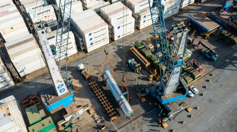 En la TCP, el secador fue elevado por dos grúas móviles (MHC), equipos capaces de levantar hasta 100 toneladas a una altura de 40 metros, y colocado sobre dos módulos MPB. “El MPB es muy versátil y más fácil de maniobrar en comparación con otros modelos de remolque, ya que los ejes de los módulos son móviles y no fijos, como en los remolques convencionales. Sin embargo, la operación de elevación y posicionamiento de la carga es extremadamente delicada, lo que requiere un equipo cualificado y maquinaria adecuada para garantizar una precisión total, asegurando la integridad de las mercancías del cliente”, explicó Fabio Mattos, director de operaciones logísticas.