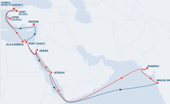 El itinerario considera las terminales de Estambul (Kumport-Marport) – Izmit (Evyap) – Izmir (Aliaga) – Mersin – Port Said E – Aqaba – Jeddah – Nhava Sheva – Mundra – Jeddah – Aqaba – Port Said – Alejandría – Estambul (Kumport).