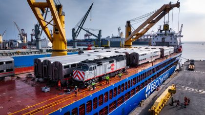 Desembarque de coches y locomotoras para tren Lima-Chosica en APM Terminals Callao