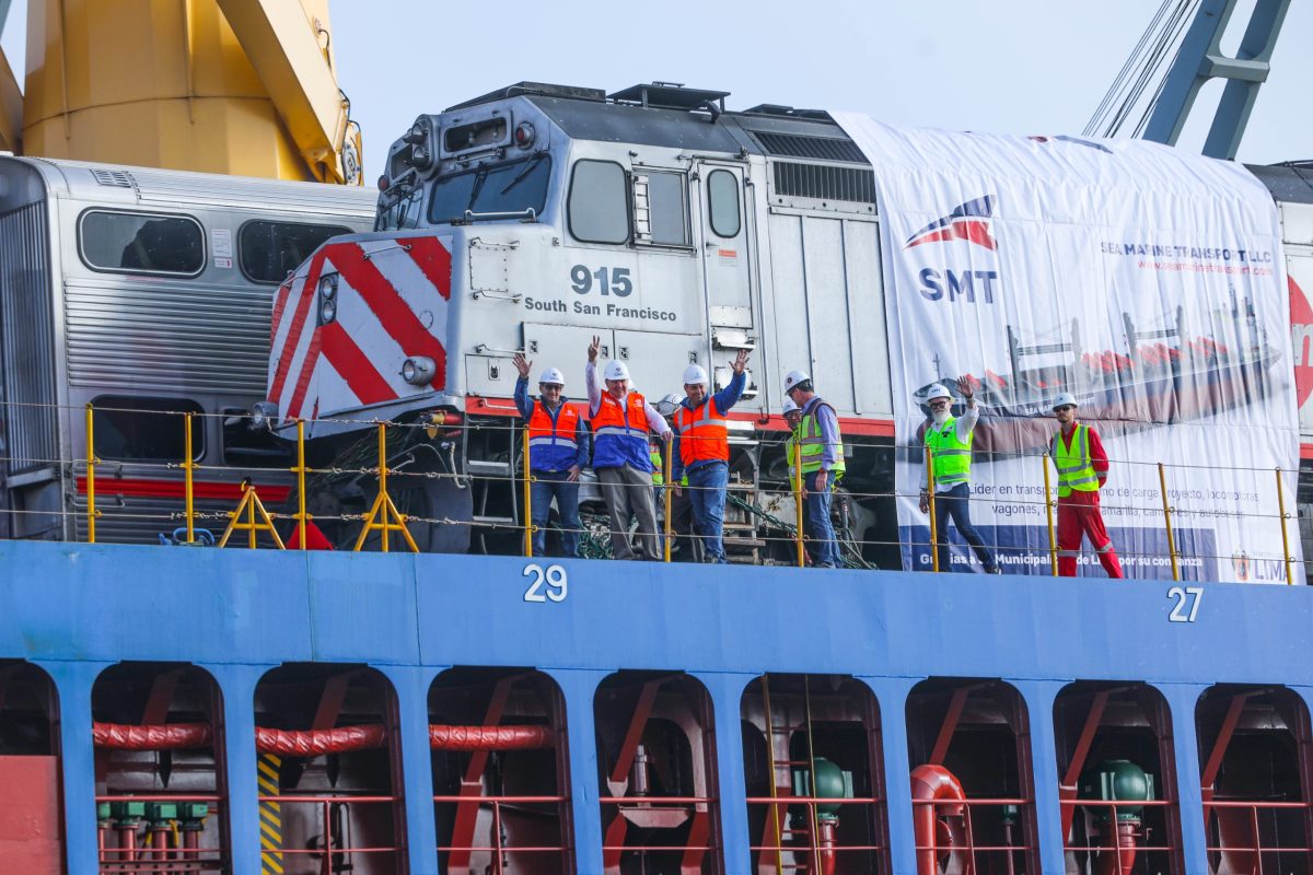 Desembarque de coches y locomotoras para tren Lima-Chosica en instalaciones de APM Terminals Callao