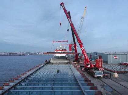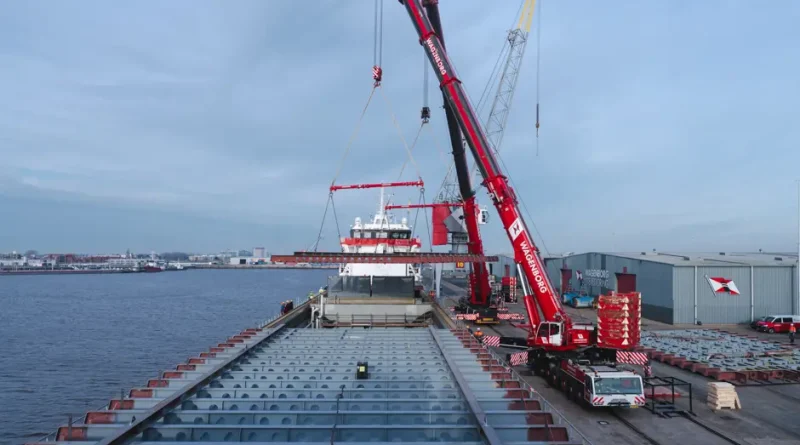 Tras ello, dos grúas móviles Wagenborg -una de 500 toneladas y otra de 100 toneladas- descargaron las cuatro escotillas del pontón y las colocaron en el muelle.